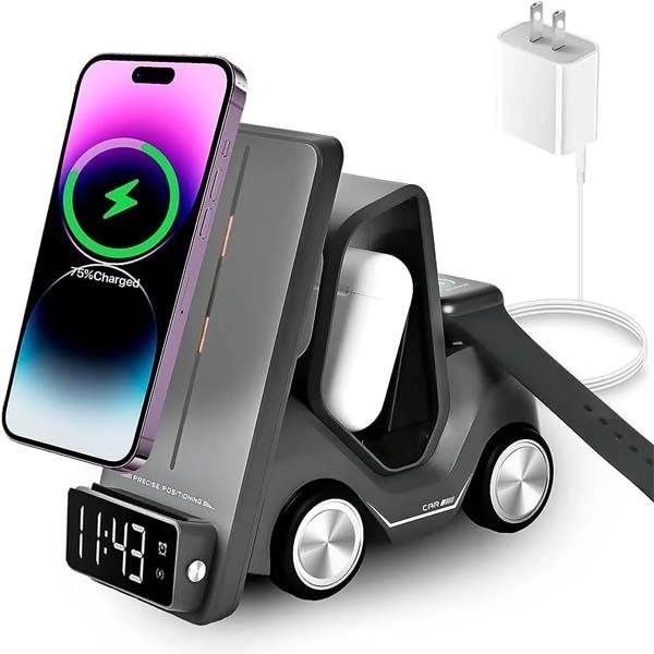 این محصول یک شارژر بی سیم بسیار باکیفیت است که بطور ویژه برای ست آیفون طراحی شده و قسمت شارژ موبایل آن برای گوشی های سامسونگ که دارای فناوری شارژ وایرلس هستند نیز قابل استفاده است. این دستگاه علاوه بر شارژ گوشی موبایل، ایرپاد، و ساعت دارای ساعت دیجیتال ( جلوی دستگاه) و نور شب (پشت دستگاه) نیز هست. ابعاد: 15.6×7.4×14.6 سانتی متر